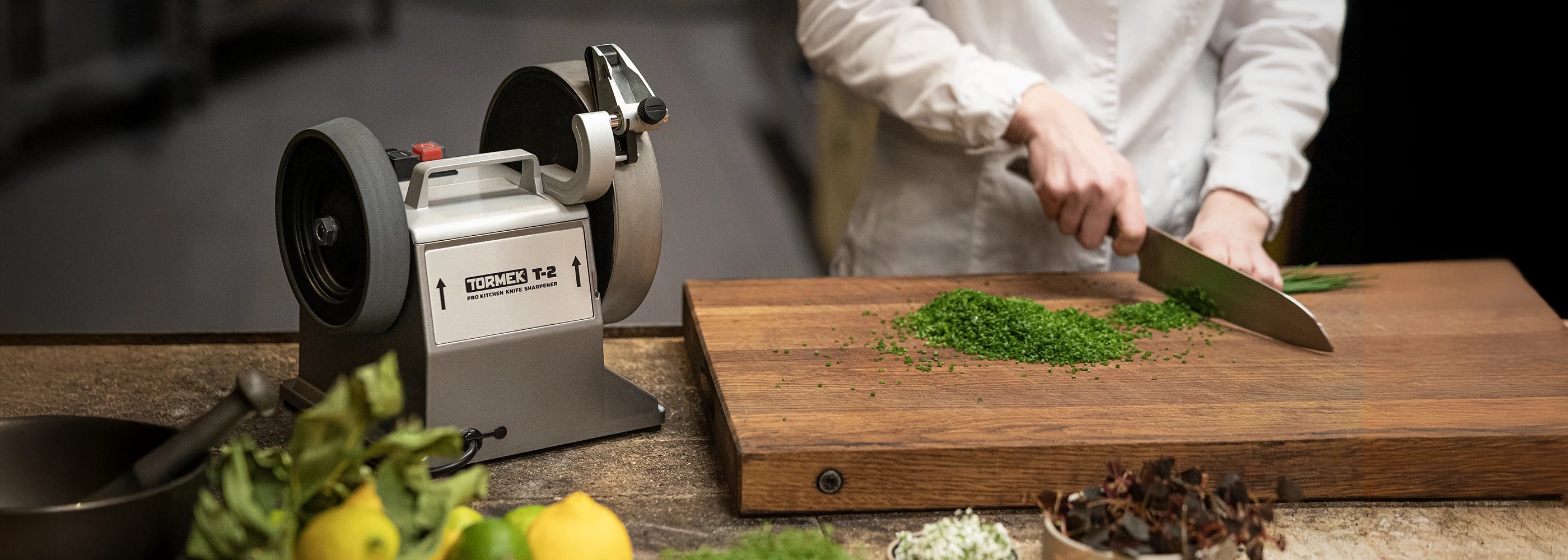 With the Tormek knife sharpening machines you can sharpen your knives to professional results. The method is the same for both the Tormek T-1 Kitchen Knife Sharpener for home chefs and the Tormek T-2 Pro Kitchen Knife Sharpener for professionals.