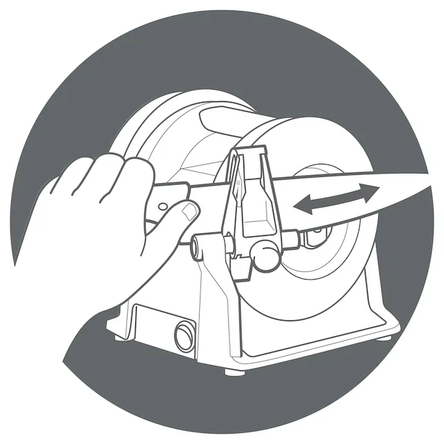 Remove the burr and polish both bevels of the knife on the honing wheel. This gives you a razor sharp and durable edge. Always hone AWAY from the edge.